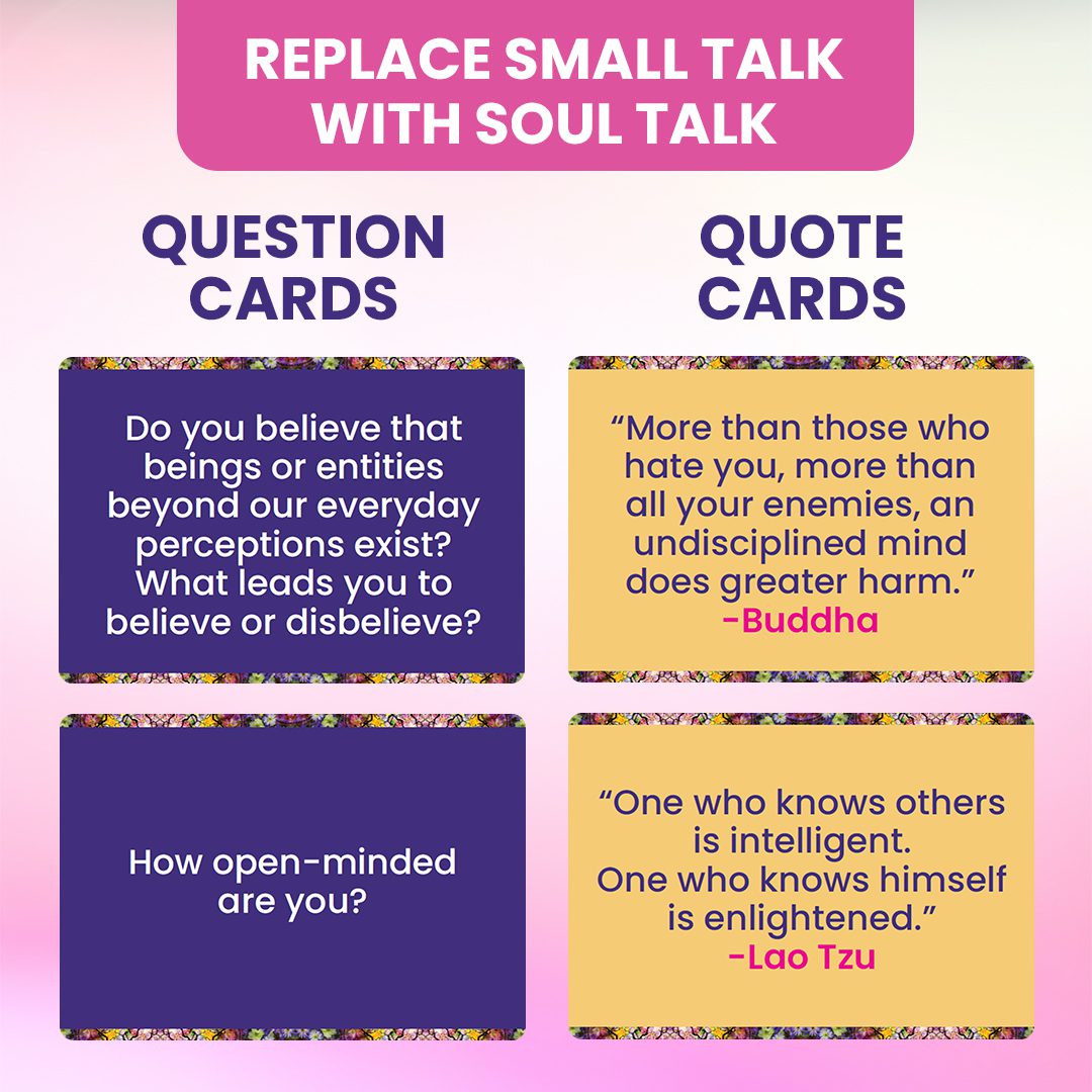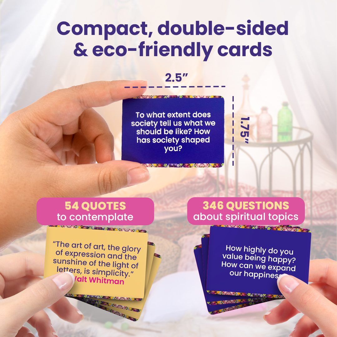 [Go on a Spiritual Journey] – Includes 400 prompts: 354 open-ended questions and 54 thoughtful quotes on double-sided 2.5″ x 1.75″ cards. These spiritual conversation starters and writing prompts span a huge range of topics that you can go deep on. Whether you want to explore your spiritual beliefs or simply enjoy conversations that go beyond small talk, the wide assortment of topics will promote deep thinking and contemplation.