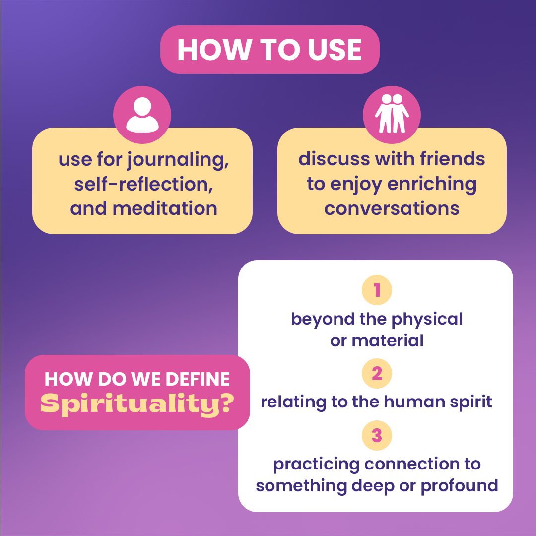 [Contemplate Solo or Connect with Others] – Sort out your spiritual beliefs by using the prompts as a guided journal or daily devotional. Or invite deep, nourishing discussions about self-awareness, beliefs, faith, and being human. Get comfortable, draw cards, and respond to them as daily journal prompts or gather your open-minded friends to contemplate life, the human spirit, and your path. Elevate your thinking, connection, and conversations with these open-ended questions.