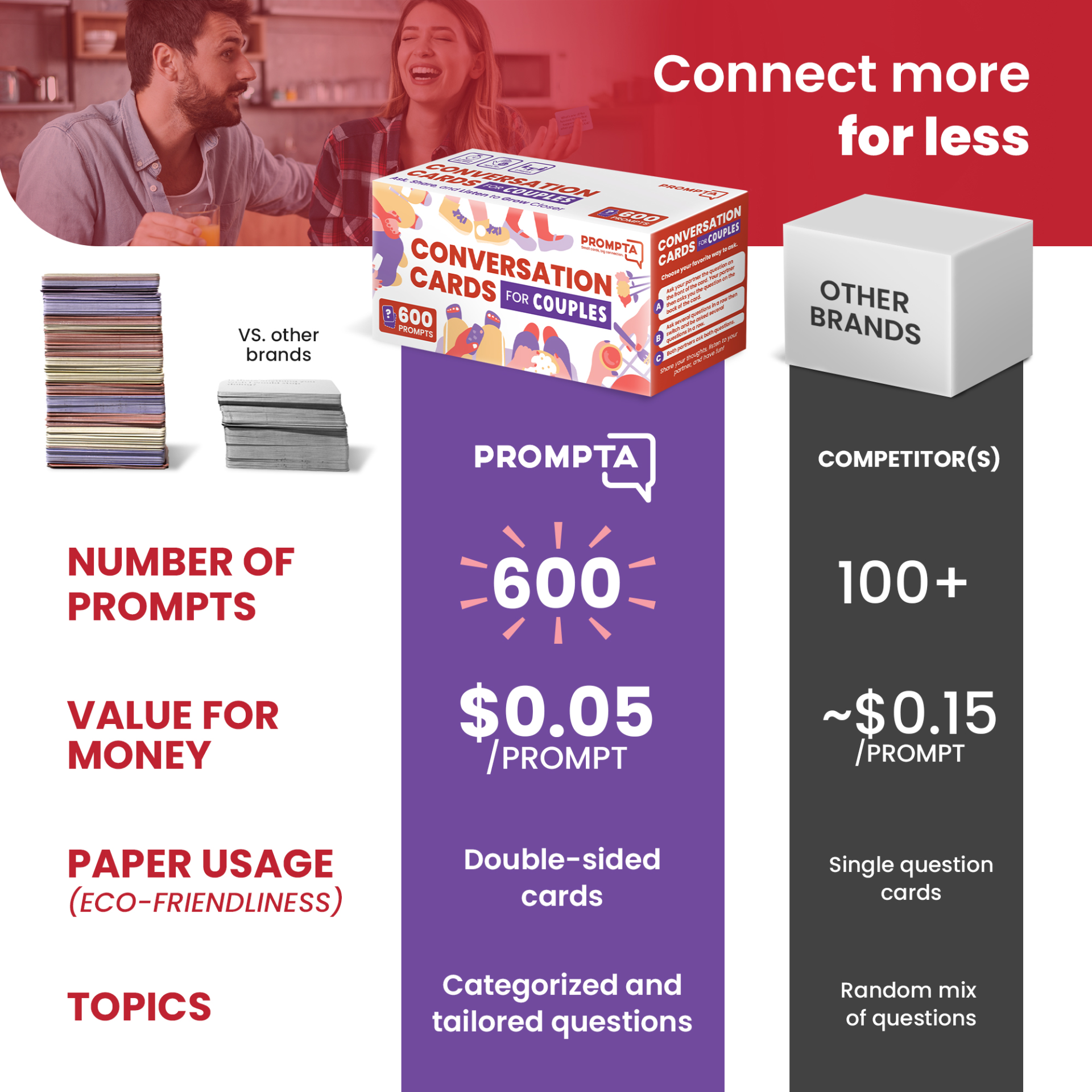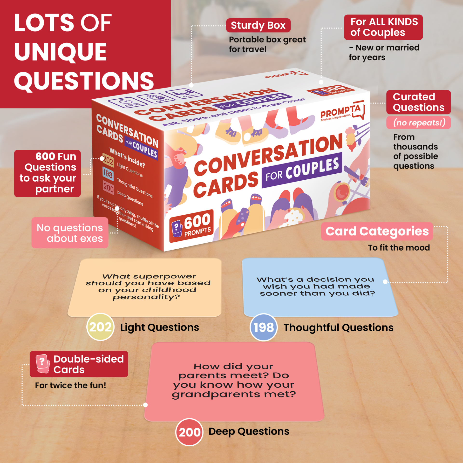 Includes 600 questions! 2-6x the number of cards offered by other conversation card sets. The cards are small (2.5” x 1.75”) and double-sided with no branding, because all that matters is the questions printed on them and the experience you and your partner have using them.