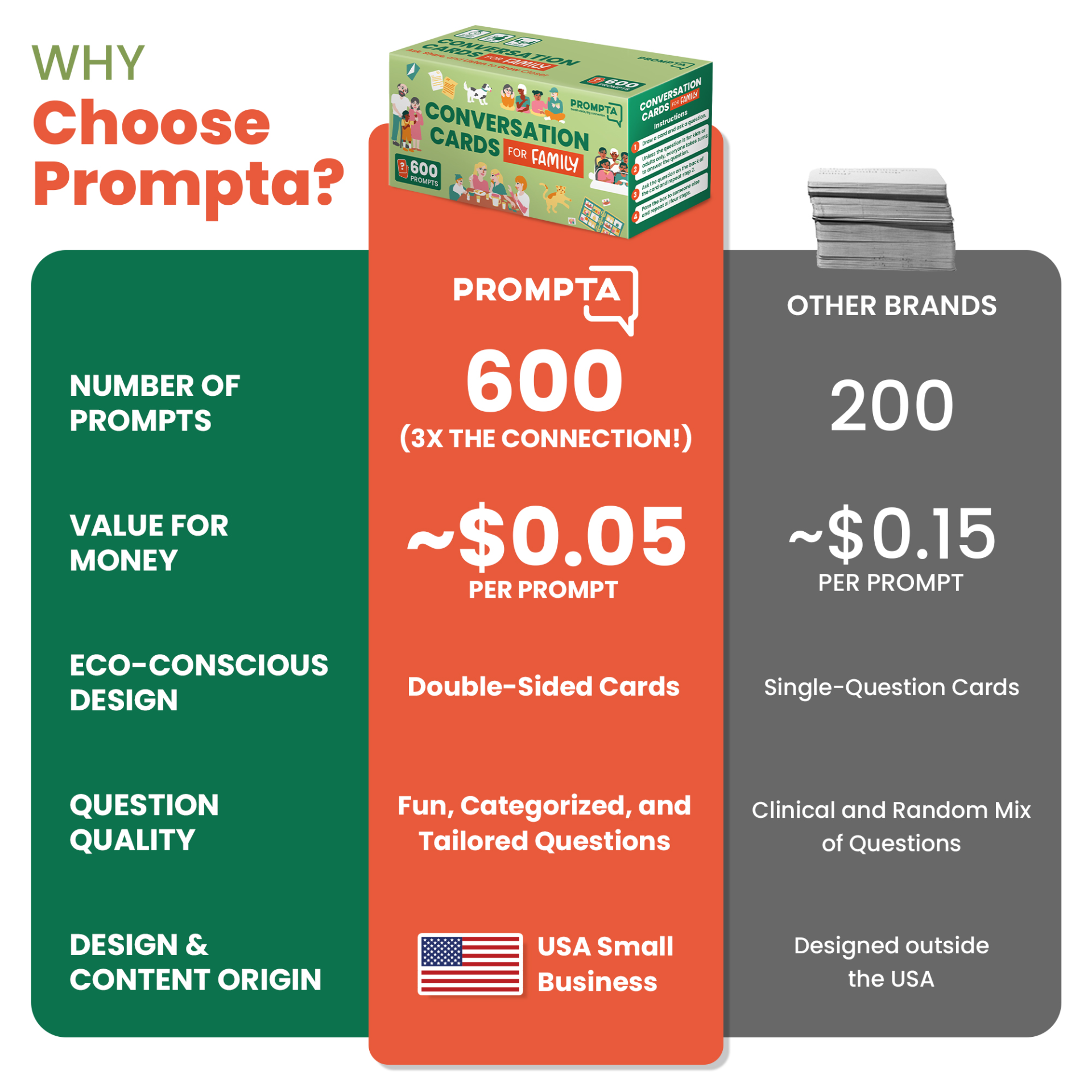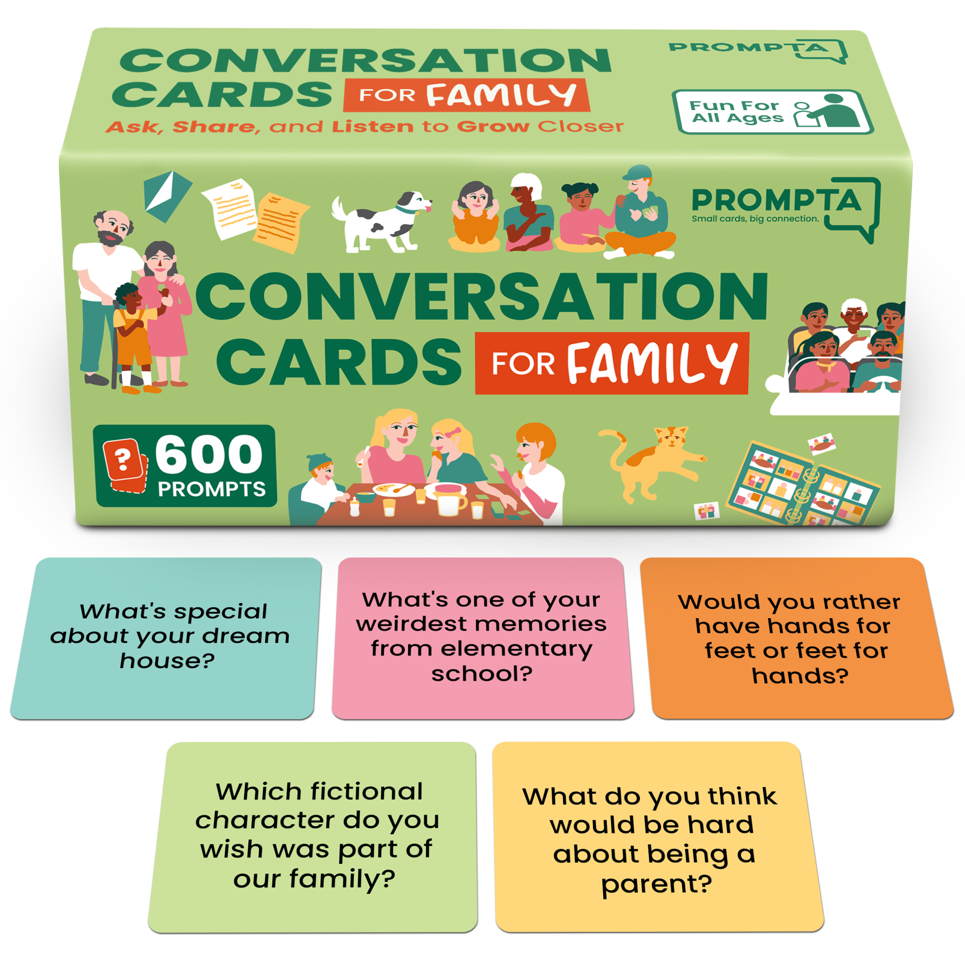 Prompta 600 Conversation Cards for Families – Fun Family Game for Kids and Adults During Game Night, Family Dinner, or Road Trips – Five Get to Know You Question Categories on 2.5″ x 1.75″ Cards