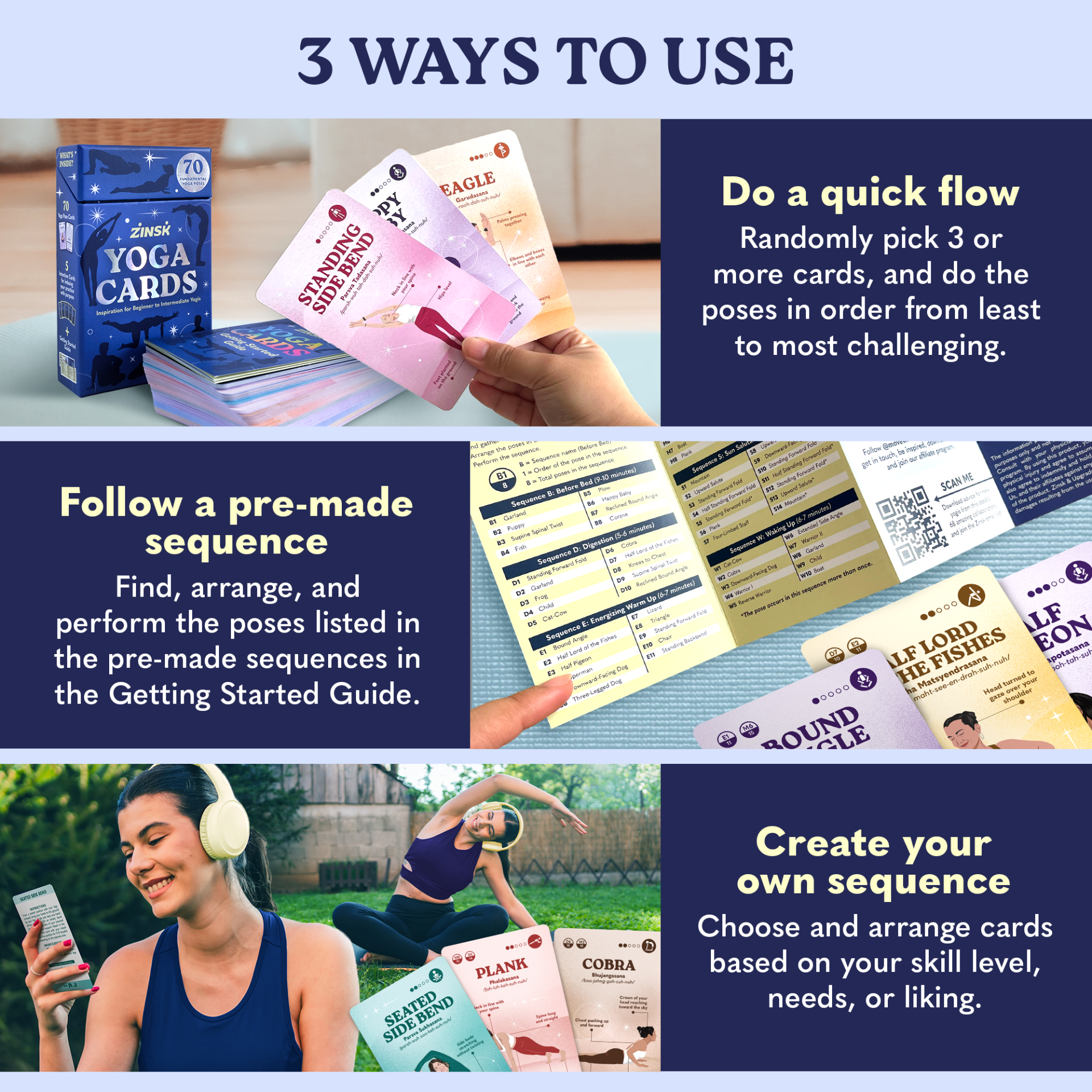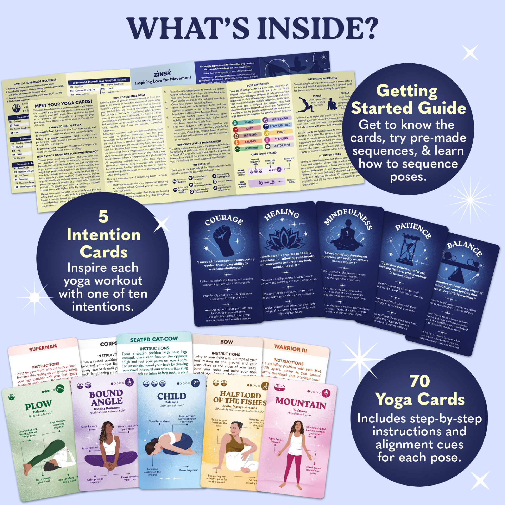Zinsk 70 Premium Yoga Cards – Pose Flashcards with Beginner Instructions, Difficulty Levels, and Sequences – Deepen Your Practice with Alignment Cues, Modifications, Sanskrit Names & 10 Intentions