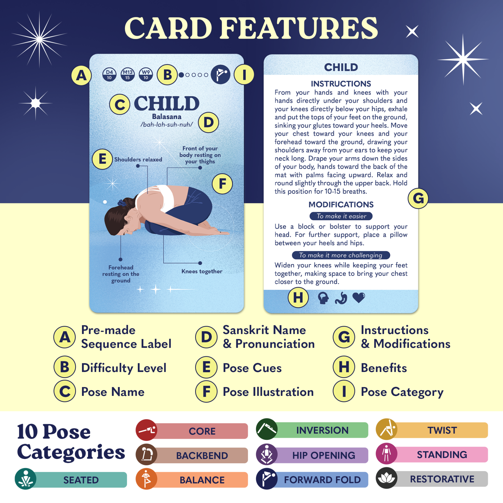 Deepen Your Practice – Explore this info-rich deck of 70 beginner-intermediate 3” x 5” yoga pose cards. Whether you’re just getting into yoga or studying for yoga teacher training, use this deck to learn pose names, categories, benefits, and tips to elevate your yoga experience!