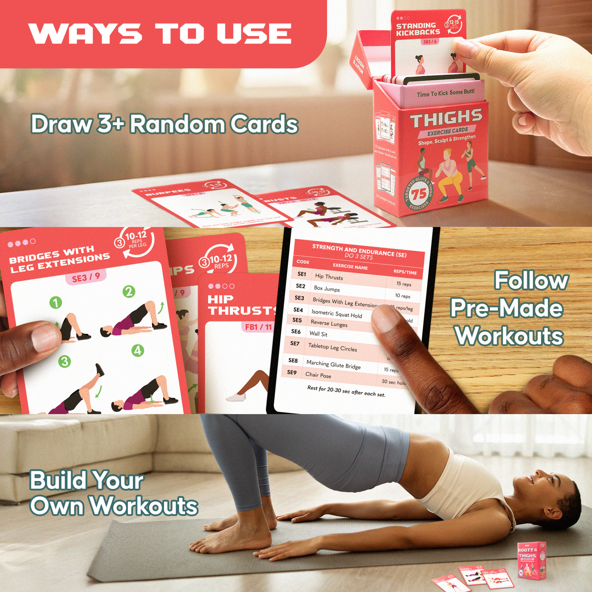[Build Your Booty and Legs at Home] – Shape, sculpt and strengthen your glutes and thighs with 75 bodyweight exercise cards. Each card includes clear instructions, easier and harder modifications, and movement cues to support safe, effective workouts.